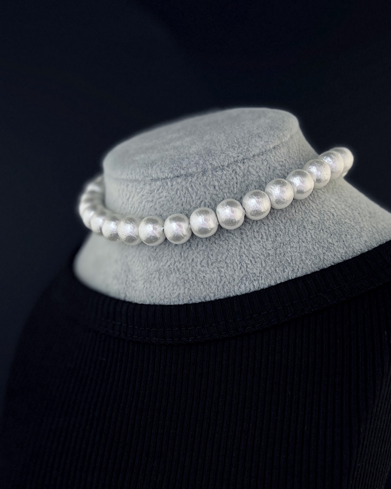 8 mmのホワイトパールを首もとにぐるりと一周させたミニマルチョーカーです。シルクのような柔らかな艶は光を受けてもきらめきすぎず、デイリーにもフォーマルにもフィット。
