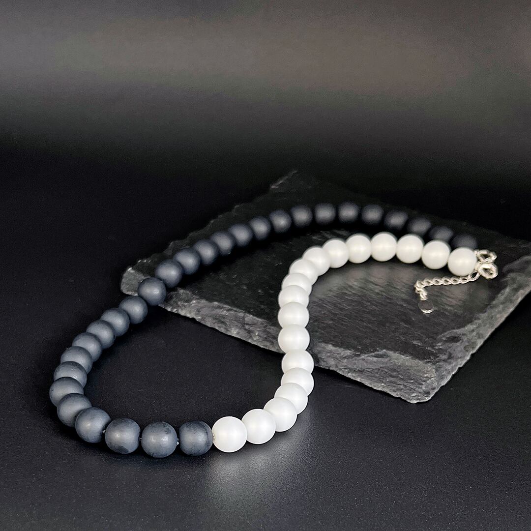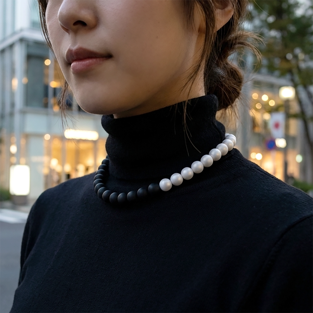 マットブラックとサテンホワイト、2 色の樹脂ケシパールを組み合わせたアシンメトリーチョーカーです。8 mm珠が描く程よいボリューム感と、Silver925パーツのクリーンな光が首元を引き締め、ジェンダー・テイストを選ばないモードな存在感をプラス。
