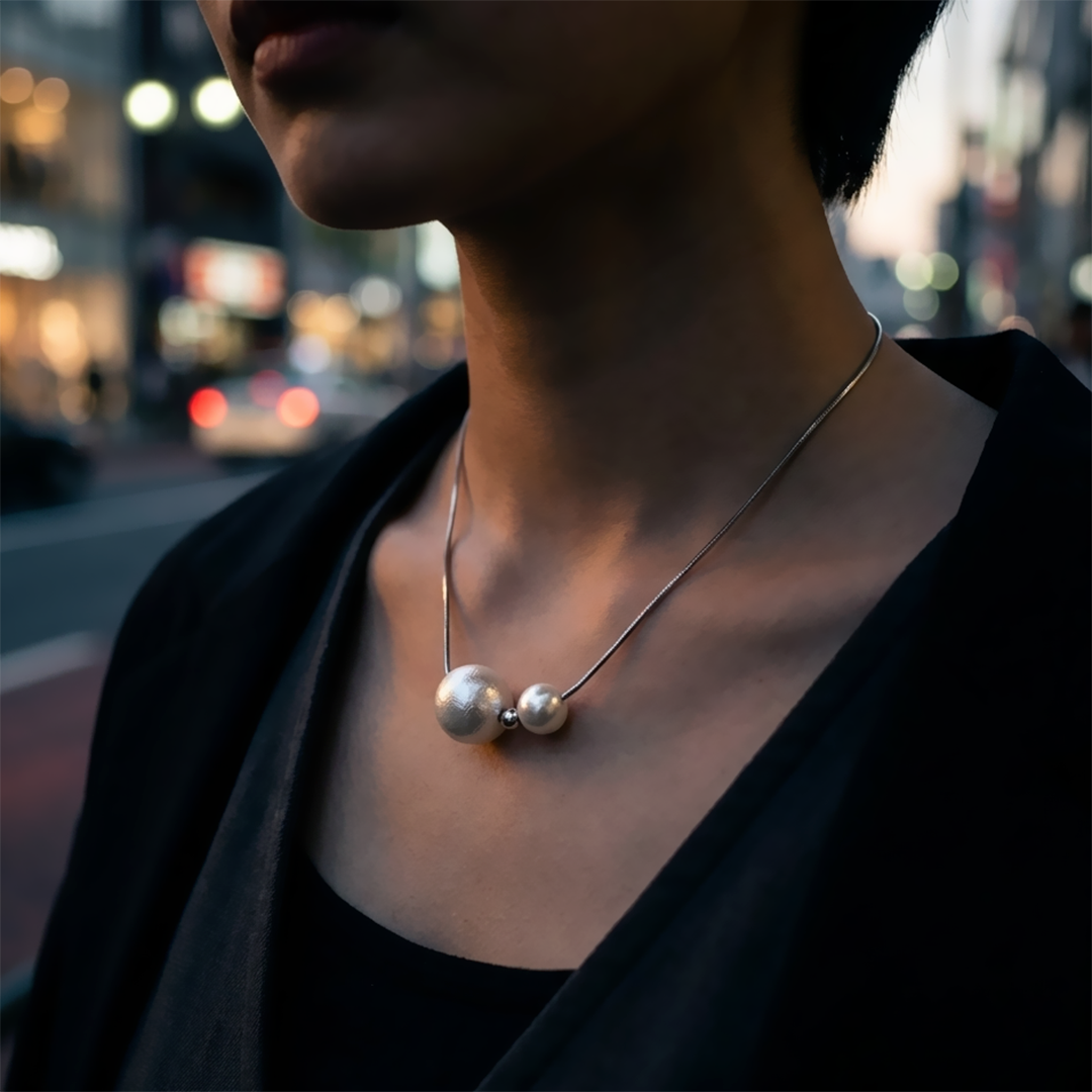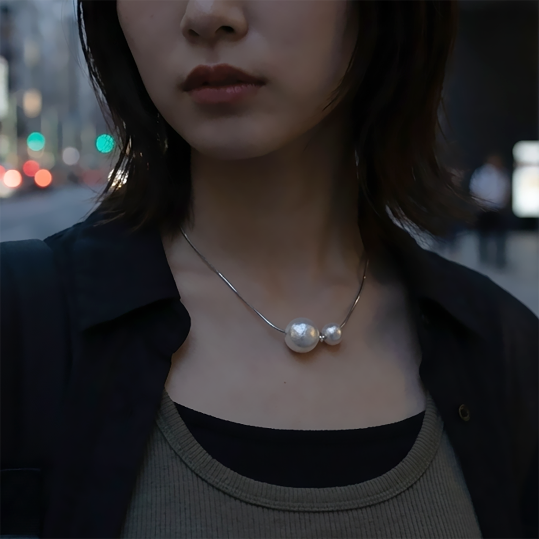 12 mmと8 mmのコットンパール、その中心にSilver925ビーズをセットし、艶やかな0.7 mmスネークチェーンに通しました。フォーマルすぎない軽やかな質感と、シンプルなのに視線を奪うバランス感で、コーディネートの“抜け”にも“締め”にも活躍。