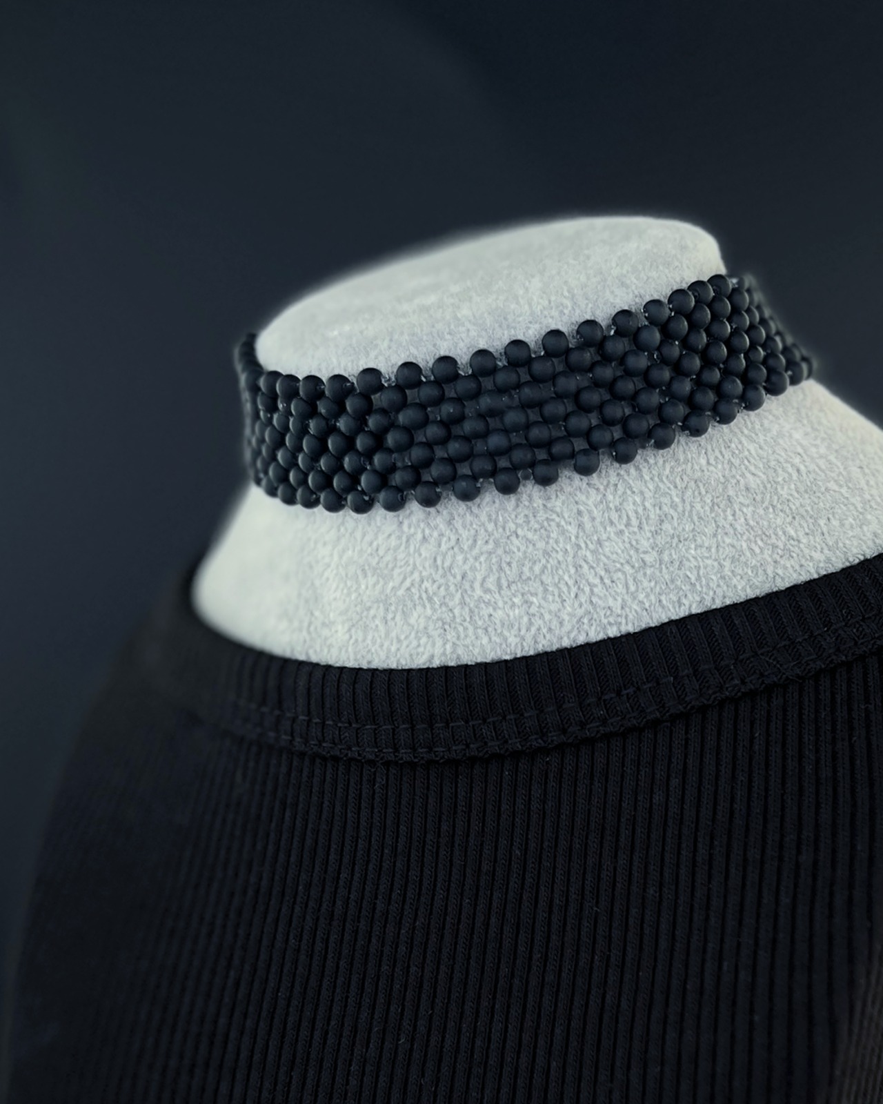3 mmブラックパールビーズ約480粒を幅約25 mmに編み上げたビーズリボンチョーカーです。