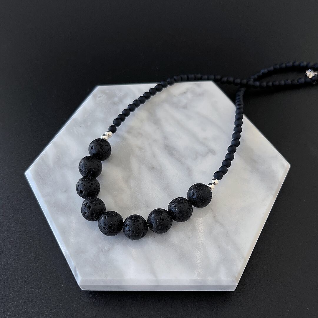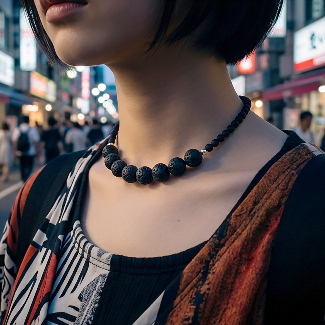 火山活動で噴出した溶岩が急冷されて生まれるブラックラバーは、マダガスカルやエトナ火山地域など産地ごとに表情が異なる天然ラバーストーン。マットな黒い質感に小さな気泡模様が浮かび、まるで月面を思わせる独特のテクスチャが特徴です。軽量かつ水や汗に強いため、アウトドアシーンでも気兼ねなく使えます。
