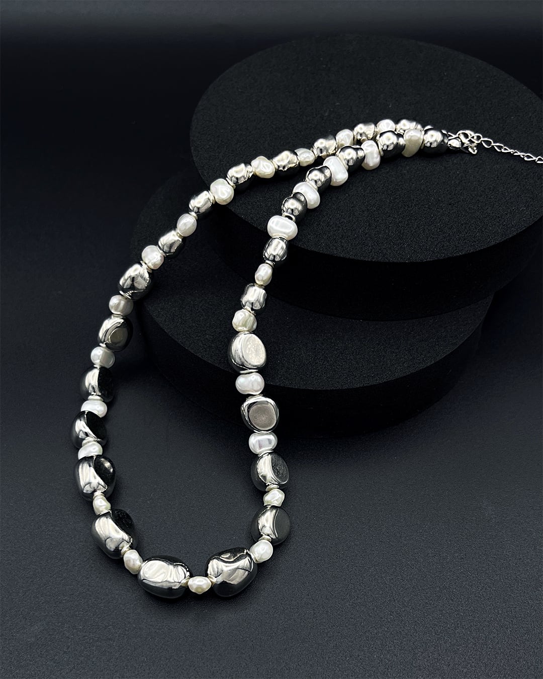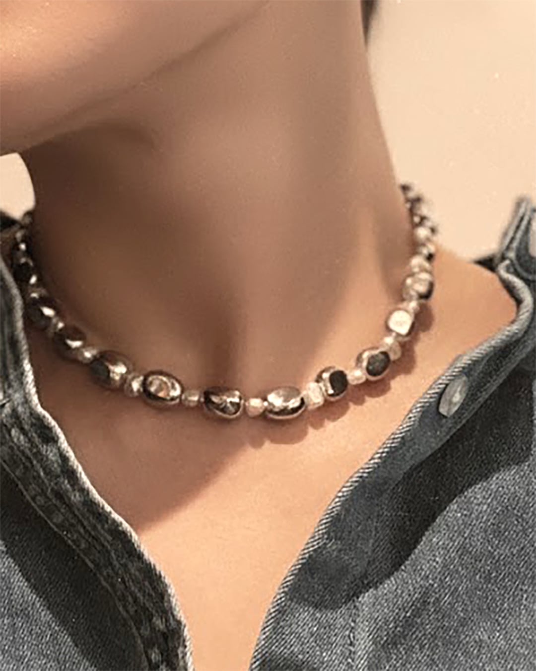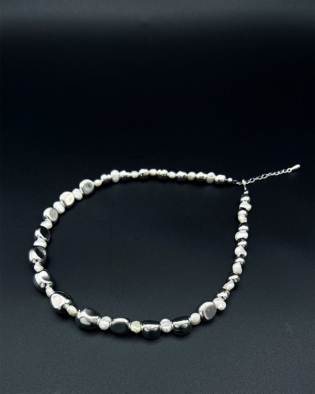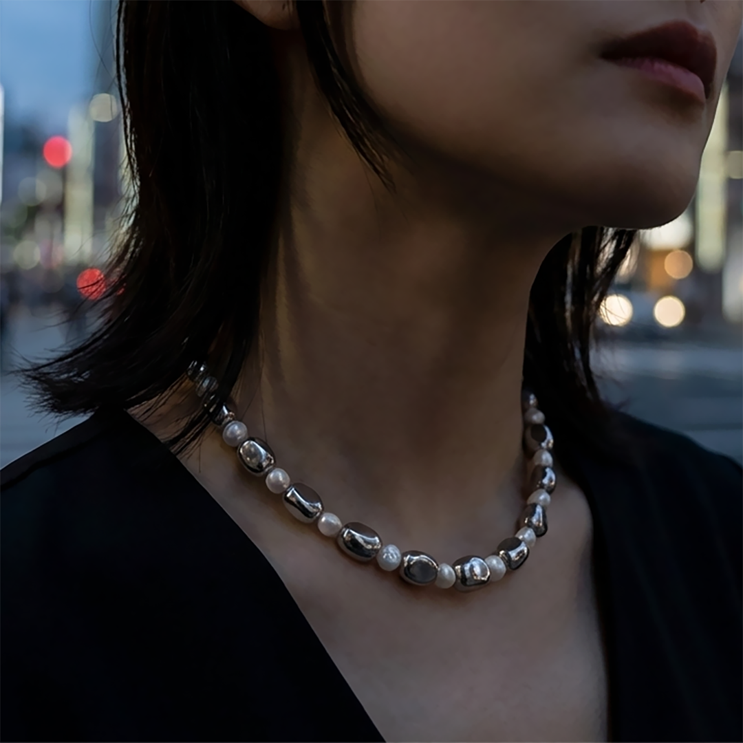 異素材がぶつかり合うように連なり、首元にアートのような立体感を生むショートネックレス。